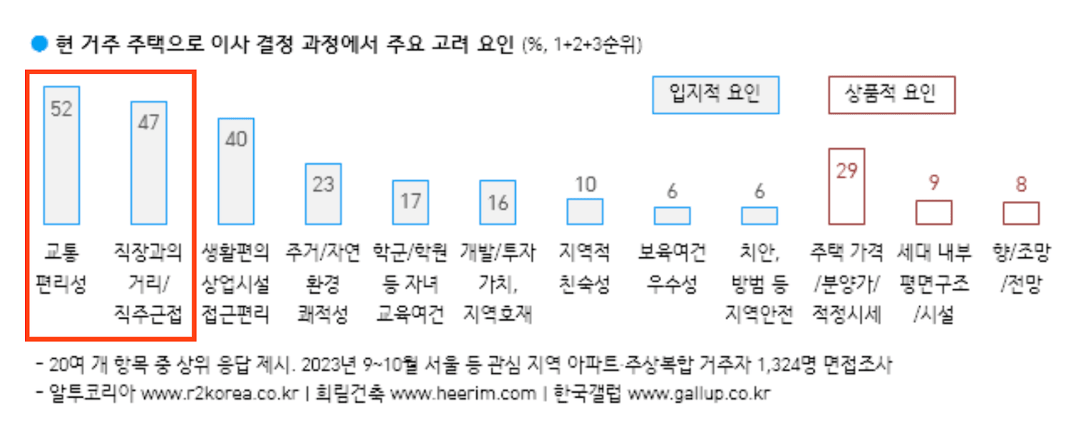 직장인들이 집을 고를 때 가장 중요하게 생각하는 요소는 "교통 편리성"과 "직주근접성"이었는데요.